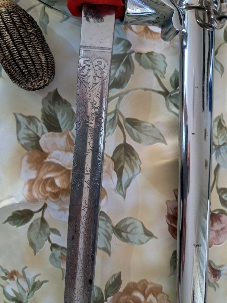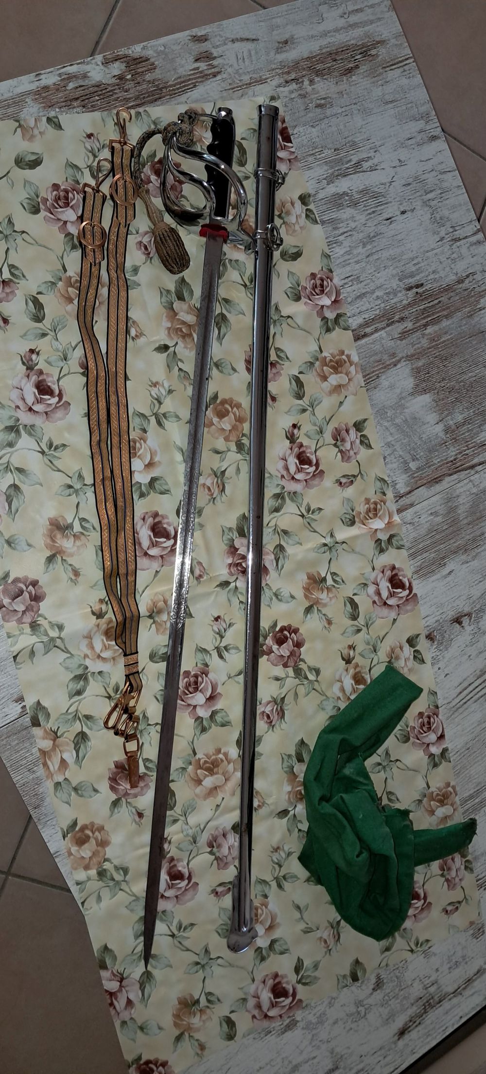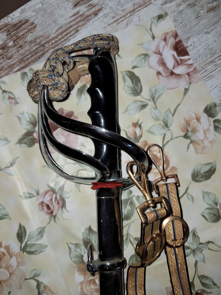 Sciabola da ufficiale completa di fodero metallico e in panno, pendaglio (per appenderla alla cintura) e dragona (un cinturino che si allaccia all'esame